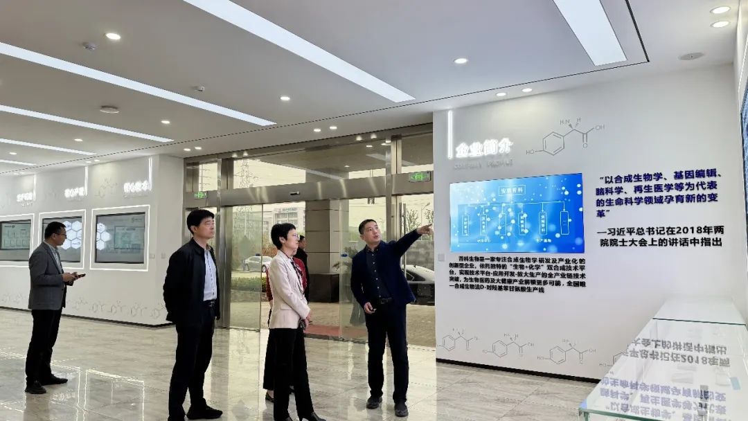 公司负责人高建伟全程陪同,向领导们详细介绍了菁科生物自成立以来的发展历程:从最初的技术探索,到如今在合成生物学与生物制造领域核心技术的突破;从产品研发方向,到当前的市场布局。每一个环节都生动呈现了菁科生物的成长轨迹与创新实力。